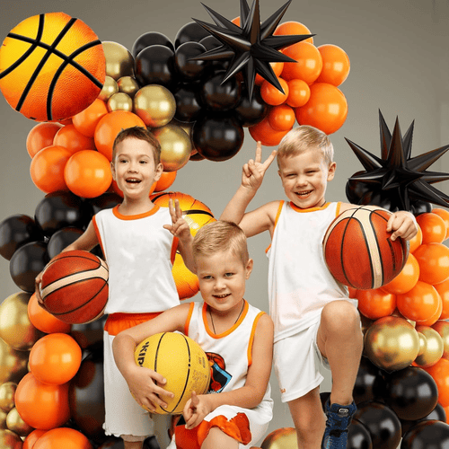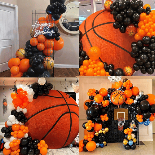 농구 풍선 화환 키트는 스포츠 정신을 상징합니다. 여러 개의 라텍스 풍선과 여러 개의 호일 풍선이 함께 제공됩니다. 농구를 주제로 한 세트인 만큼 이번 세트의 컬러는 오렌지와 블랙이 주를 이루며, 레이어를 다르게 하여메탈릭 골드 라텍스 풍선도 추가됩니다. 전체적인 스타일이 매우 매력적이어서 파티 분위기를 즉각적으로 향상시킬 수 있습니다.