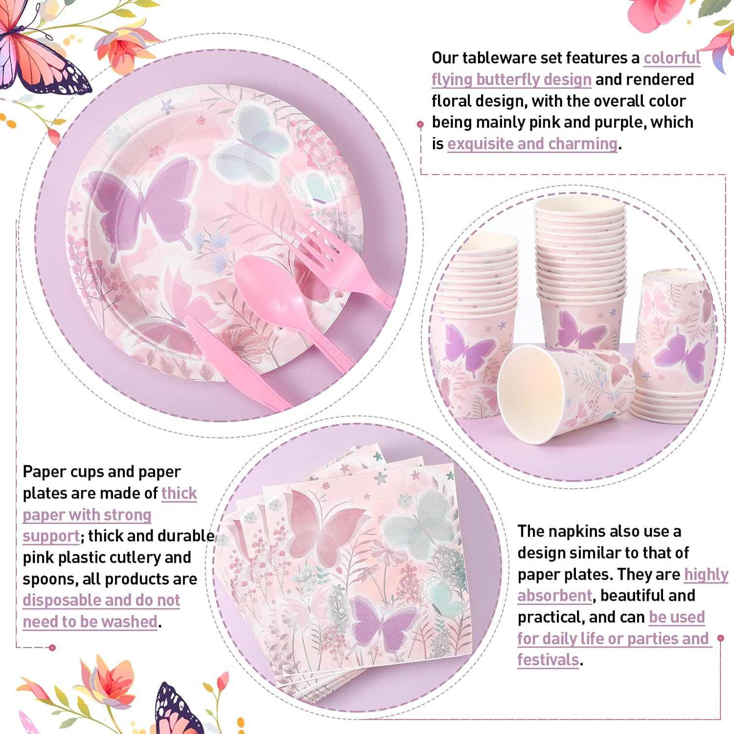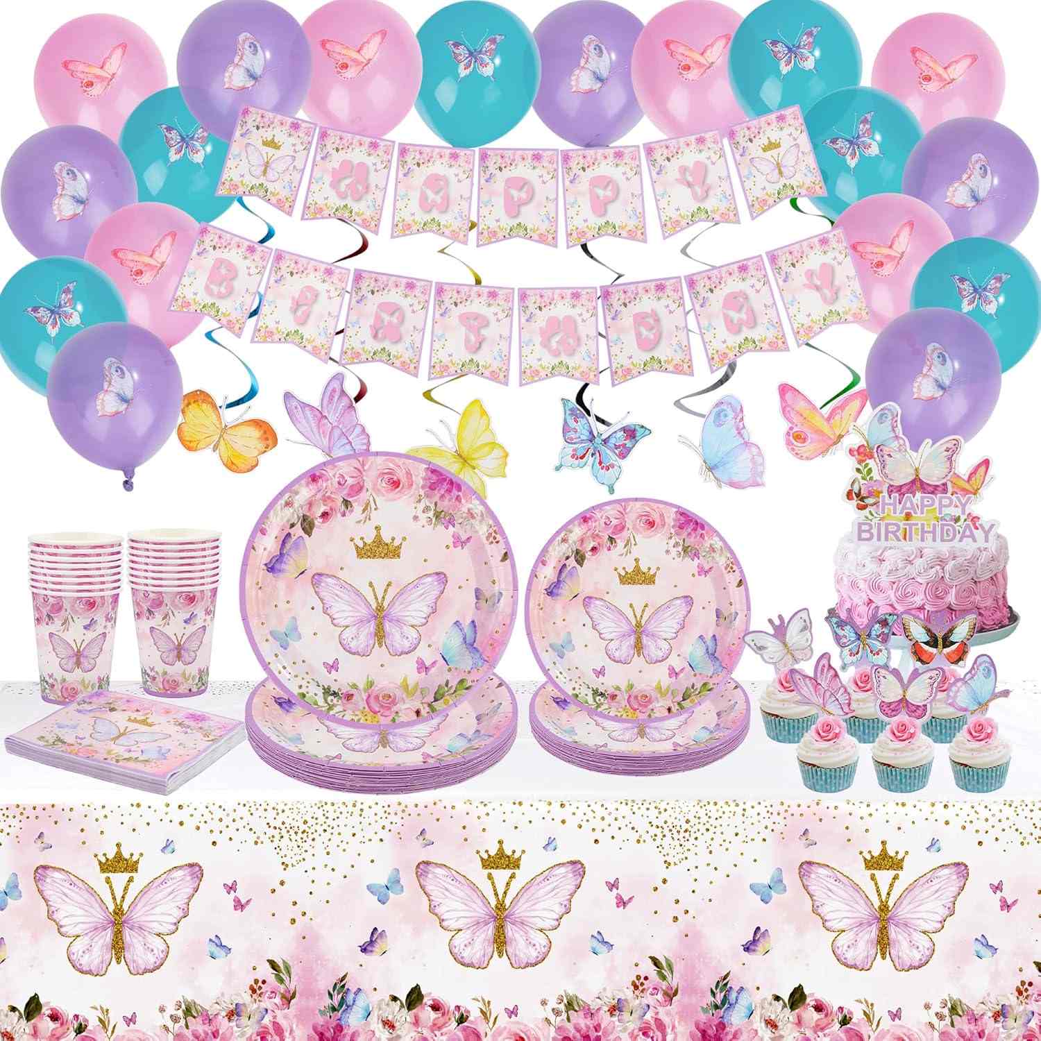 파티 장식을 위한 탁월한 옵션은 나비 파티 식기 세트입니다. 냅킨, 종이접시, 종이컵, 포크, 나이프가 포함되어 있습니다. 각 작품에는 나비 부분이 표시됩니다.