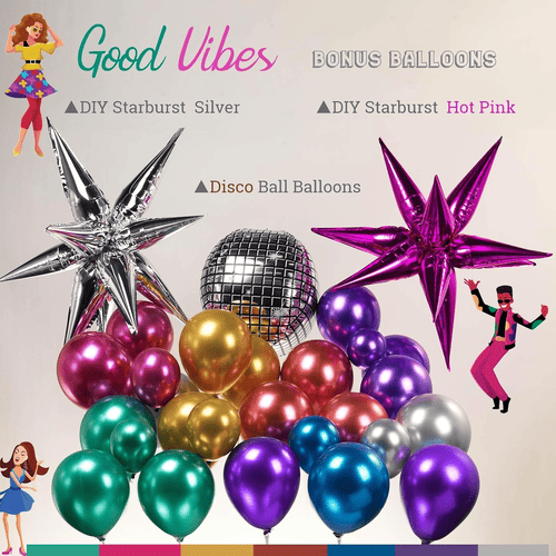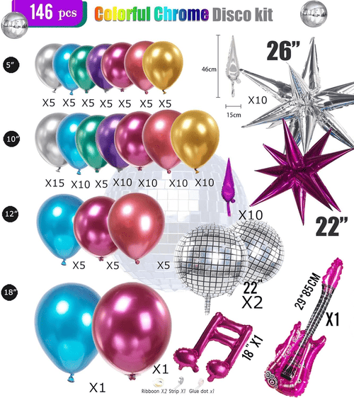 그만큼디스코 풍선 아치 키트주로 구성되어 있습니다다채로운 라텍스 풍선 그리고다양한 호일 풍선. 반짝이는 크롬 스타일을 만들기 위해 저희가 제공하는 라텍스 풍선은 금속성 라텍스 풍선으로 표면이 매우 아름다운 금속성 광택을 가지며 실내외 모두에서 탁월한 결과를 얻을 수 있습니다. 크기는 5인치, 10인치, 12인치, 18인치가 있습니다.