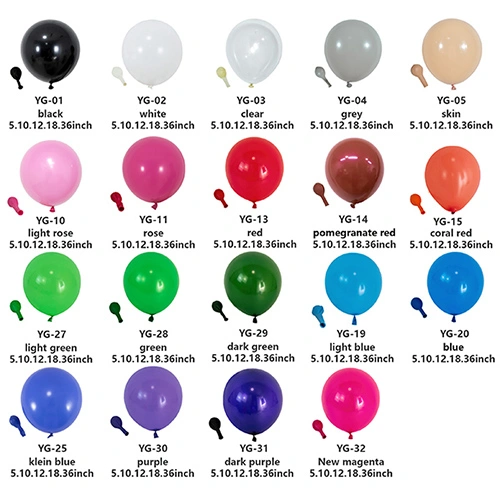 라텍스 풍선은 장식 및 엔터테인먼트 품목으로 널리 사용됩니다. 이 풍선은 색상과 사용 방법이 다양하여 다양한 상황에서 매우 인기가 높습니다. 매트한 빨간색, 노란색, 파란색, 녹색부터 레트로한 핑크와 보라색, 그리고 금색과 장미색 같은 금속성 톤에 이르기까지 고품질 풍선은 놀라운 시각 효과를 만들어내고 다양한 시나리오의 요구 사항을 충족할 수 있습니다.