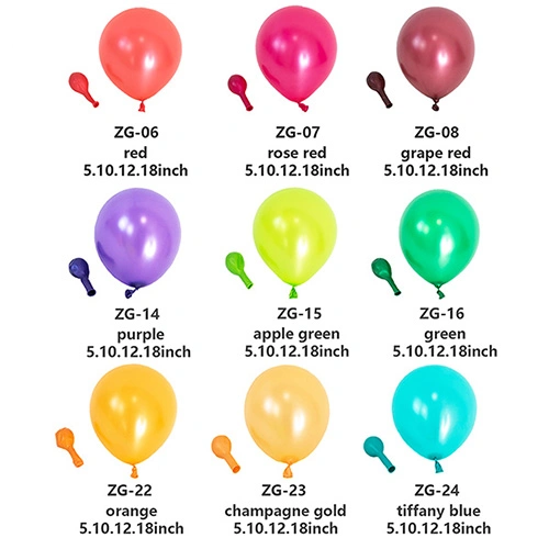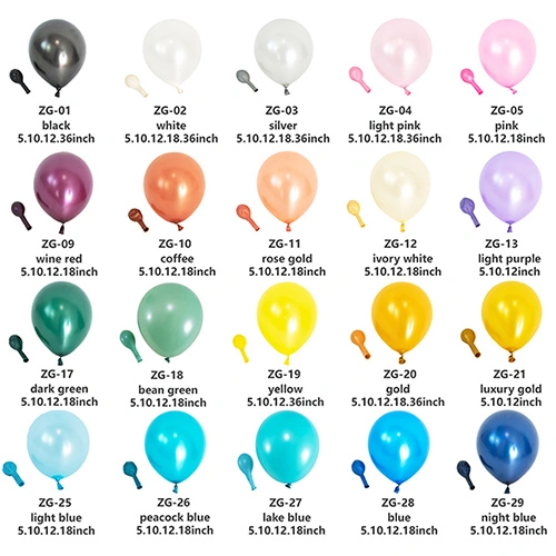 진주 풍선:부드럽고 매끄러운 표면과 반짝이는 진주 가루를 갖춘 이 풍선은 가장 부드럽고 가장 생생한 색상을 특징으로 하여 결혼식이나 발렌타인 데이와 같은 고급 행사를 장식하는 데 이상적입니다.