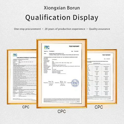 ASTM F963(미국 장난감 안전 표준):제품이 미국 시장의 무독성 요구 사항을 충족하고 어린이 및 실내 사용에 적합한지 확인합니다. 이 인증은 Amazon 및 미국 시장에서는 필수입니다. 귀하가 당사에서 풍선을 도매로 구매하는 경우 당사는 귀하에게 인증 사용 권한을 부여해 드립니다.
