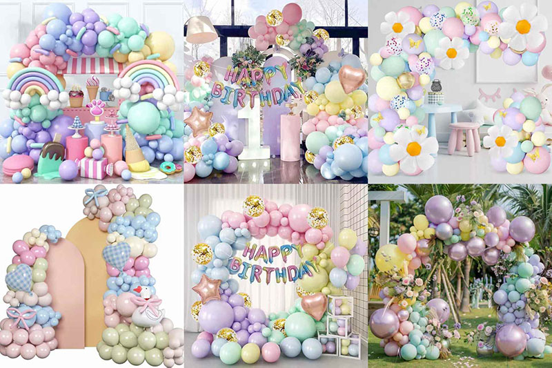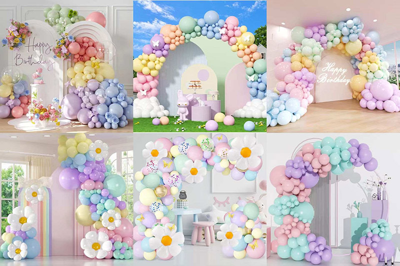 이러한 조합으로 마카롱 풍선 화환 아치는 부드럽고 로맨틱한 스타일을 연출할 수 있습니다. 또한 다양한 상황에 맞게 산뜻하고 귀엽고 스타일리쉬하고 고급스럽거나 화려하고 우아한 룩을 연출할 수 있습니다.