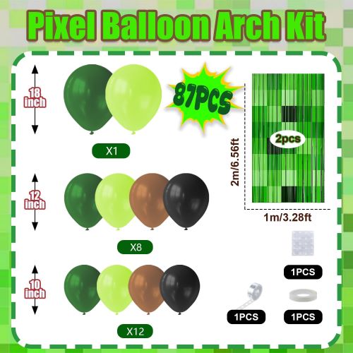 이 생일 마인크래프트 풍선 아치 키트는 무광택 짙은 녹색, 무광택 사과 녹색, 무광택 검정색 및 무광택 갈색으로 덮여 있습니다. 10인치 풍선, 12인치 풍선, 18인치 풍선이 있습니다.