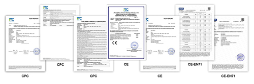 당사의 모든 제품은 유럽, 미국 및 기타 목표 시장 안전 규정을 엄격히 준수하여 CPC, CE, EN71 및 기타 권위 있는 인증을 통과했습니다. 이러한 자격은 귀하의 상품이 원활하게 통관을 통과하고 해외 시장에서 규정 준수 위험을 완전히 피하는 데 도움이 될 수 있습니다.